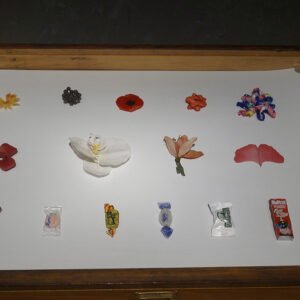 Des fleurs en tissu, en plastique, en fibres trouvés et conservés