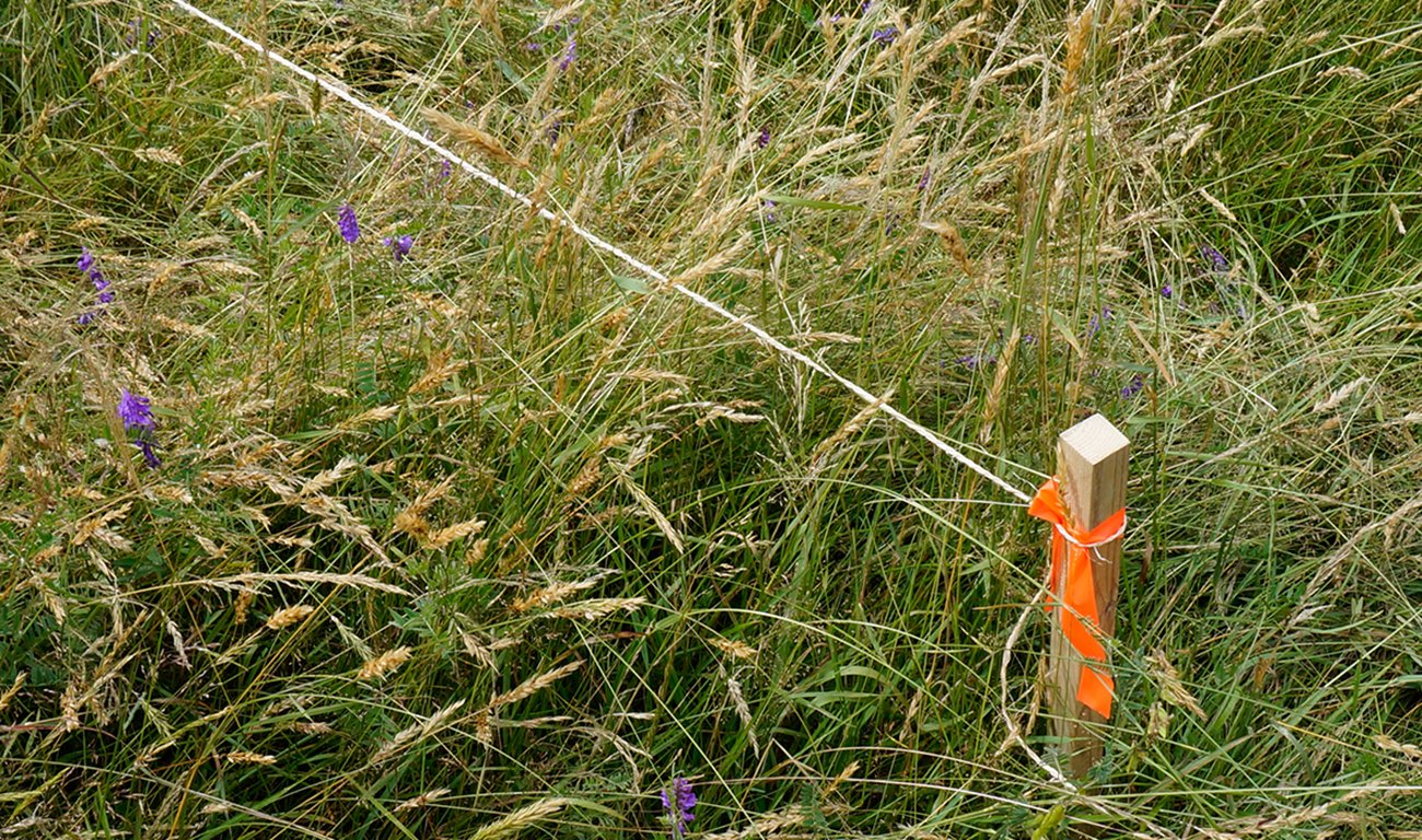 J’ai d’abord tracé une voie d’accès en tondant un axe à travers les herbes longues, ouvrant le champ vers un point au fond du terrain. Puis, un carré de 12 mètres par 12 mètres a été délimité par des piquets et tondu mécaniquement. À l’intérieur, j’ai dessiné au sol, à l’aide de cordes tendues, le plan fictif de ma maison — cuisine, salon, chambre — inscrivant une architecture invisible dans le paysage.