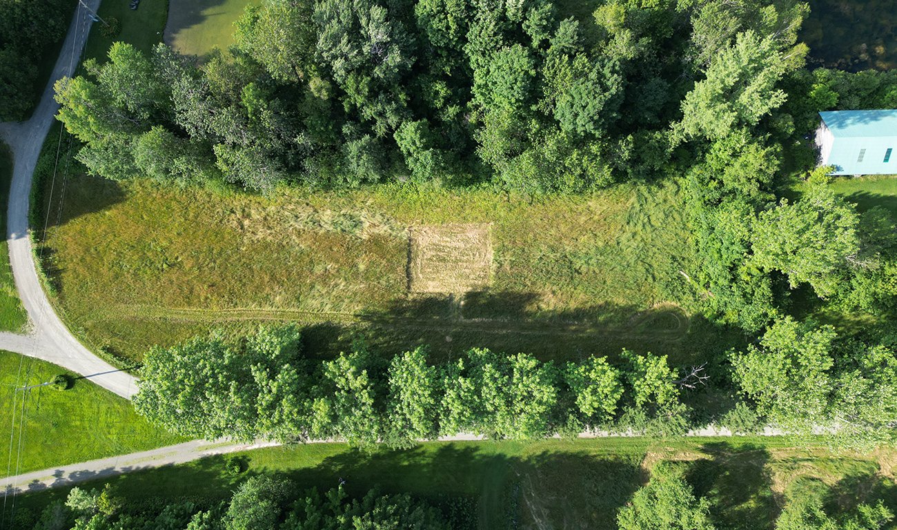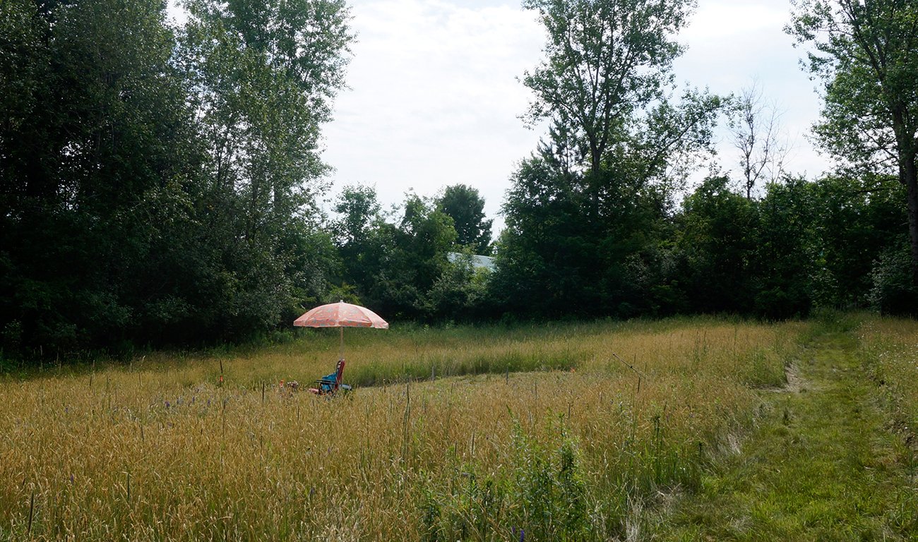 Sur « le pré des moutons », ainsi nommé par la propriétaire des terres, le champ grouille de vie. Chevreuils, ratons laveurs, oiseaux, insectes et fleurs sauvages y cohabitent dans un écosystème qui se régénère au fil des saisons. C’est dans ce milieu vivant que j’ai choisi d’intervenir en posant un geste volontaire d’appropriation : agir symboliquement comme propriétaire.